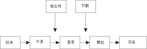 物料与粘合剂在圆筒形容器中由底部混合浆充分混合成湿润软材,然后由侧置的高速粉碎浆切割成均匀的湿颗粒。